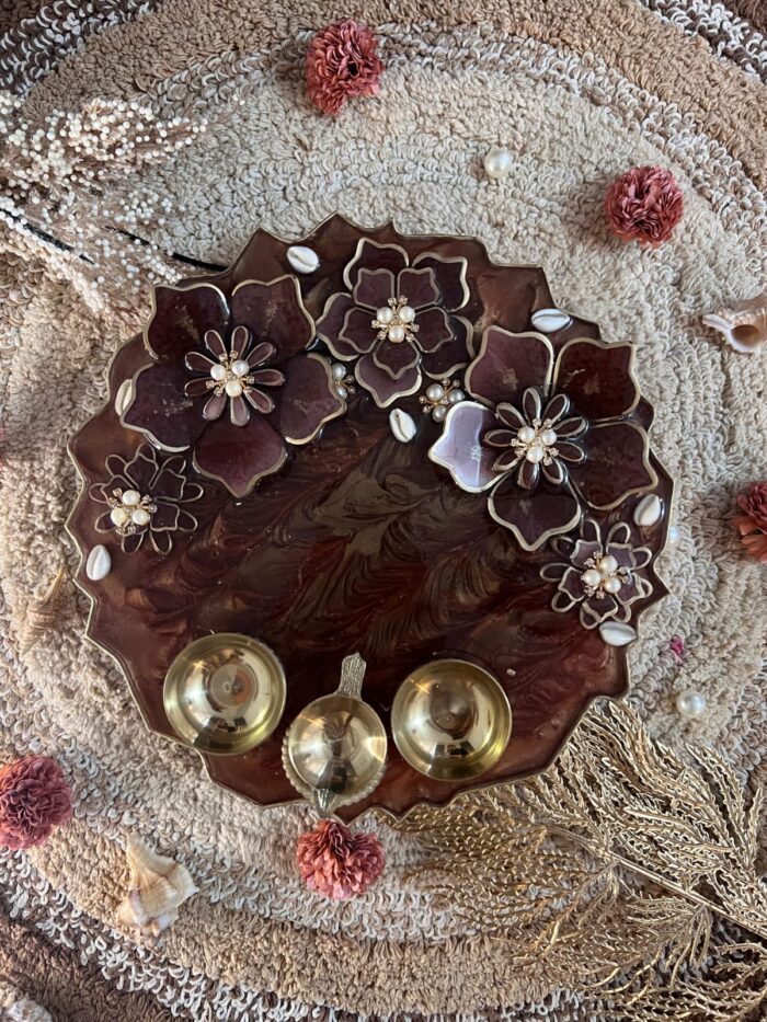 Enhance your spiritual practices with our exquisite resin spiritual pooja thali. This beautifully crafted thali combines tradition with elegance, offering a perfect centerpiece for your religious rituals and ceremonies.