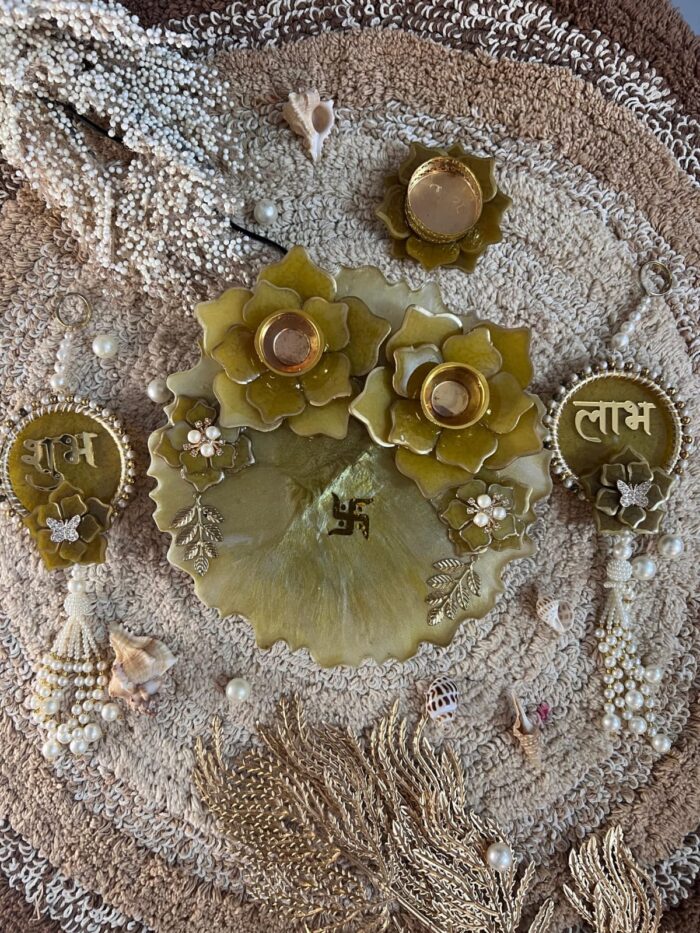 Enhance your spiritual practices with our exquisite resin spiritual pooja thali. This beautifully crafted thali combines tradition with elegance, offering a perfect centerpiece for your religious rituals and ceremonies.