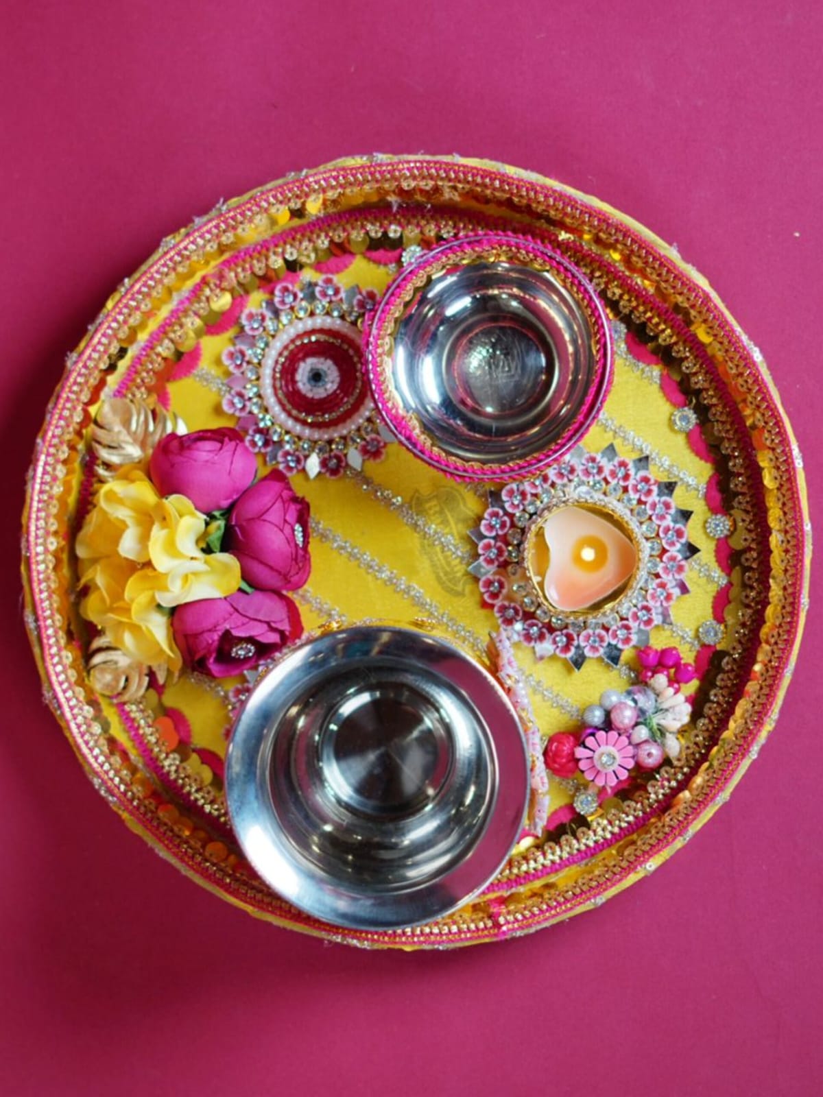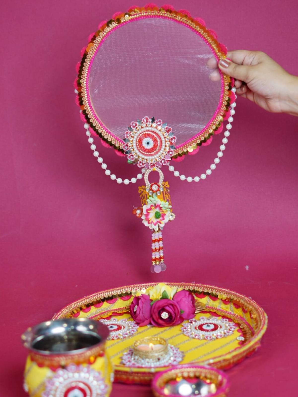 Celebrate the eternal bond of love and togetherness with this elegant Karwa Chauth Thali Set, designed to make your rituals truly special.